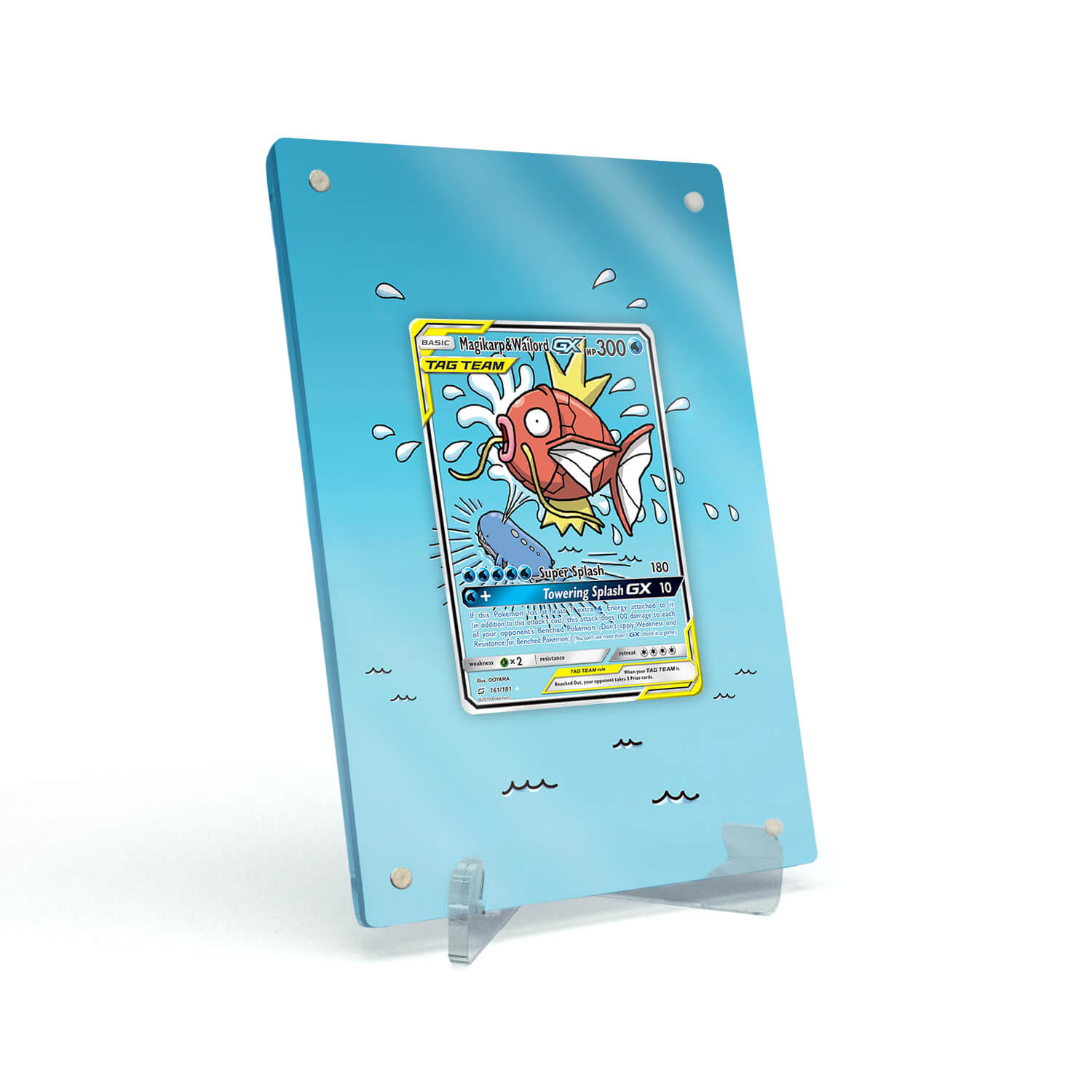 Unser magnetischen Extended Artwork Display Case Rahmen ist passend für Pokemon Magikarp and Wailord GX Team Up TEU 161 RAW Karten inklusive passendem Acryl Ständer.