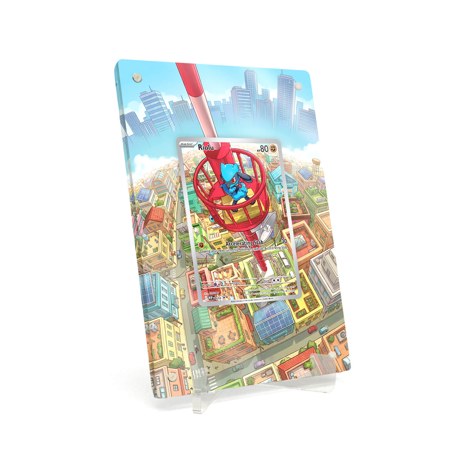 Unser magnetischen Extended Artwork Display Case Rahmen ist passend für Pokemon Riolu Mega Evolution Promos #010 RAW Karten inklusive passendem Acryl Ständer.